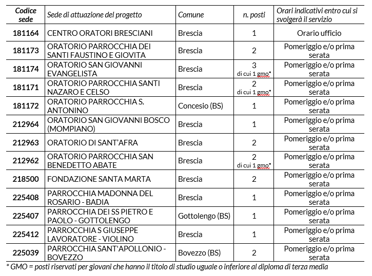Ambito: ORATORI | Posti: n. 21 | progetto REGIONALE